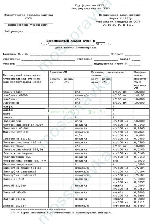 Справка 228/у (биохимического анализа крови по форме 228/у) — это медицинский дкоумент с результатами анализа, который дает возможность врачам определить состояние здоровья пациента: