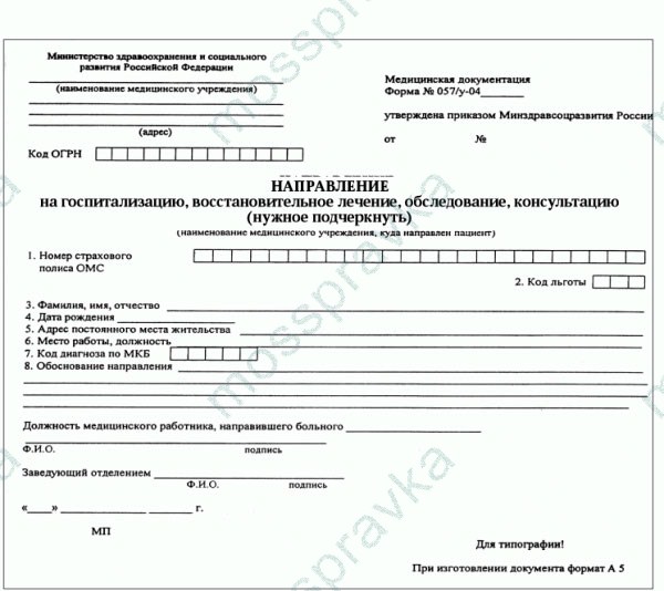 Бланк в бумажной или электронной версии называется «направление на госпитализацию, обследование, консультацию», его оформление регламентирует Приказ № 255 от 22.11.2004 г. В левом углу записывается наименование заведения, предоставившего документ, его ОГРН. Форма 057/у-04 устанавливает обязательное заполнение полей о персональных данных гражданина, его прописке, номере полиса ОМС, дате рождения, трудоустройстве, должности. Отмечается основной диагноз в кодировке МКБ, код льготы, запись о лечебном учреждении, куда пациент планирует отправиться, причины перенаправления, дата выдачи справки. Делается отметка о должностном положении медработника, доктор и заведующий отделением проставляют подписи, печать.